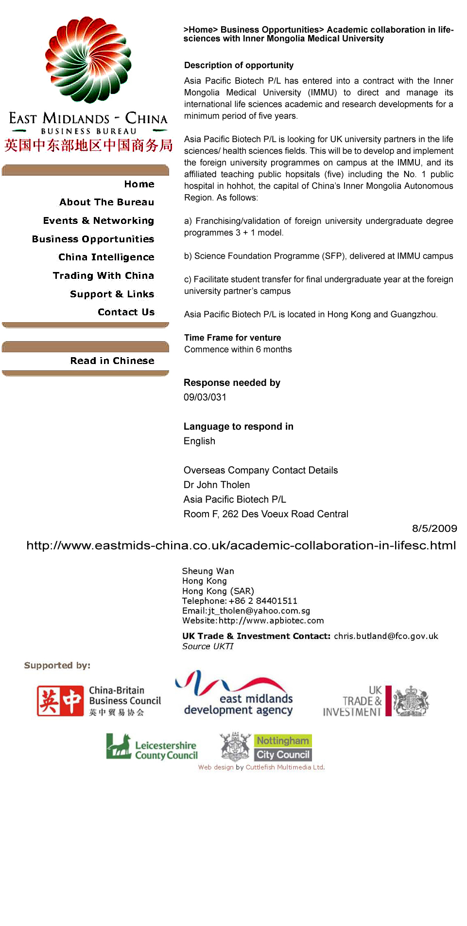 While achieving the desired student academic performances, we also met stakeholder expectations, Our revenues (SGD20 million per annum) surpassed all projections inspite of the SARS 2002 pandemic. During the same period UNSW SIngapore returned SGD40 million in losses. As industry practitioners, we are in the best position to be innovative with industry relevant learning outcomes (skills based)..The Centre for Biomedical Scences and Mangament continued to be an icon for life science education and a major revenue generator for its stakeholders over a decade. Toward the end of 2004, Dr Tholen also established the School of Life Sciences at the Singapore Productivity and Standards and Inovation Board in collaboration with the University of Western Australia. In 2008, the following advetisiement was posted by UK Trade and Investment See East Midlands - China Business Bureau This project involved the development and delivery of several laboratory based degree programmes in nursing, biotechnology, pharmacy, psychology and pharmaceutical management (pathology, quality systems, operations and regulatory compliance). Lehman Brown International reported the financial audit for the period 2009 to 2012. Revenues exceeded RMB144 million |